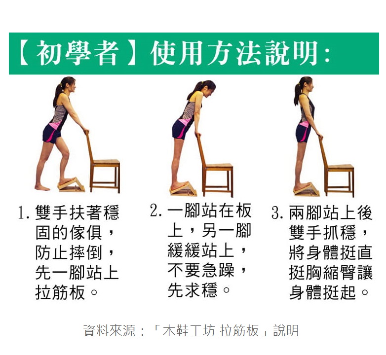 下面這是「木鞋工坊拉筋板」的圖,畫得很清楚,引用一下,僅供參考,並沒有特別推薦產品的意思。